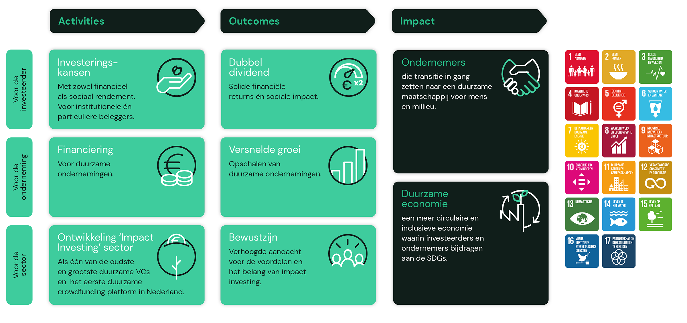 Impact investeren is nog steeds een niche-activiteit. Wij willen daar mainstream gedachtengoed van maken. Hoe we dat doen kun je zien in het Theory of Change model wat wij daarvoor volgen: in eenvoudige stappen maken we duidelijk wat het doel is, waarom dat het doel is en hoe we dit kunnen bereiken.